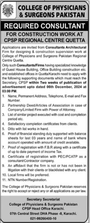 The CPSP College of Physician & Surgeons Pakistan seeks highly qualified individuals who are committed to the advancement of healthcare education and medical research. The specific qualifications required will vary based on the role, but some common requirements include: