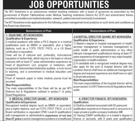 For most positions, candidates should possess relevant degrees, certifications, and experience in the healthcare or administrative field. MTI Nowshera values candidates who demonstrate a commitment to professional growth, patient care, and teamwork. Strong communication skills, a positive attitude, and a willingness to contribute to the institution’s mission of delivering quality healthcare are crucial attributes for all applicants.