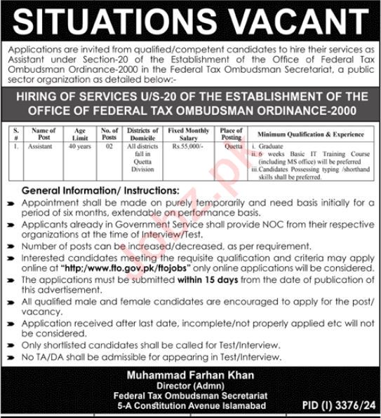 To apply for the latest positions at the Federal Tax Ombudsman Secretariat, candidates can visit the official FTOS website or regularly check government job portals. Job vacancies are typically posted with detailed instructions on how to apply, including the required documents and deadlines.