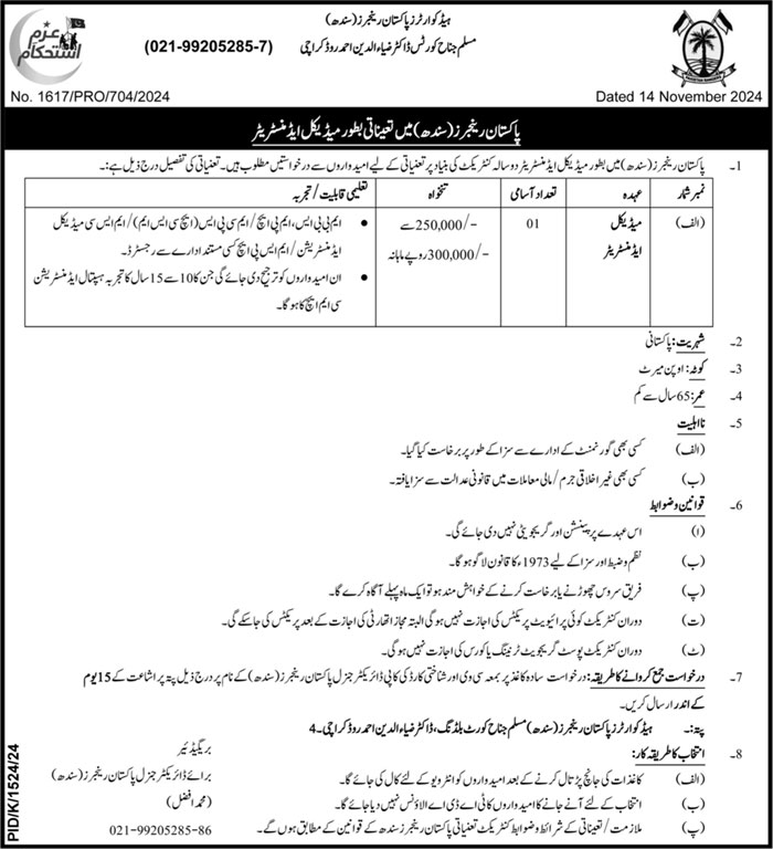 Medical Administrator Jobs In Pakistan Rangers Sindh 2024