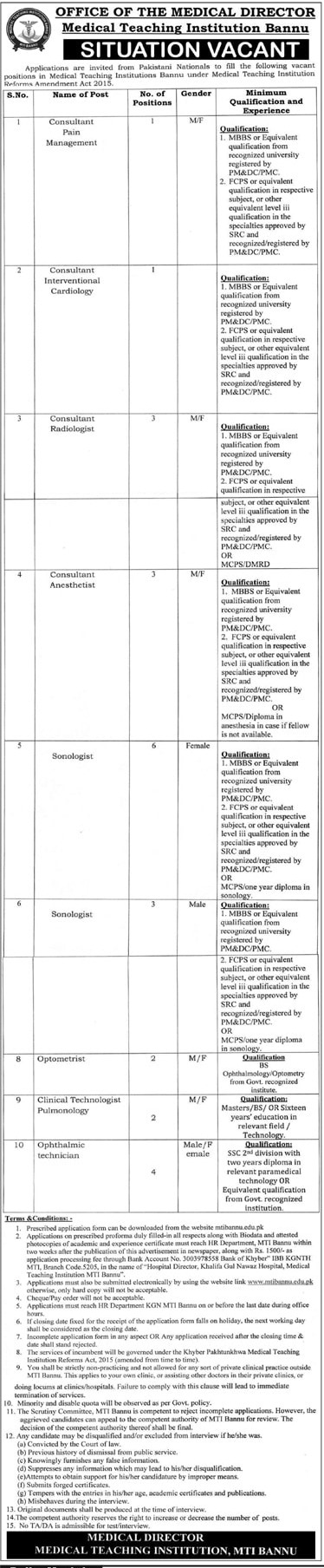 Each position at MTI Bannu has specific educational and professional requirements. For medical and clinical positions, applicants must hold relevant medical degrees and certifications from recognized institutions. For example, consultants and specialists should have post-graduate qualifications in their respective fields, while medical officers must have MBBS degrees with experience in clinical practice.