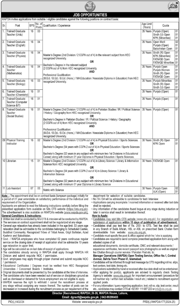 WAPDA’s teaching job listings for 2024 cover a wide range of academic and technical disciplines, aimed at supporting the educational development of its staff and their families. These positions offer a fantastic opportunity for teachers and educators to contribute to WAPDA’s growth, while also providing a stable and rewarding career path in the public sector. Below are some of the key teaching positions that are likely to be available: